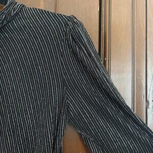 Party-ready Marc Jacobs dress with gold/silver metallic stripes and dramatic puff shoulders.
