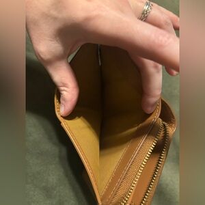 Elegant and practical Marc Jacob’s wallet in camel brown leather. Like new condition without tags. It was used once. Features a snap closure compartment with card slots and a pocket for cash. Zipper compartment fits additional cards/cash/coins. Additional pockets at the front and rear of the wallet.