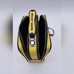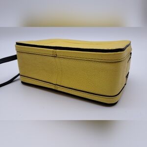 Design: A "small and mighty" camera-style bag featuring a grained leather exterior and a bold embossed logo on the front