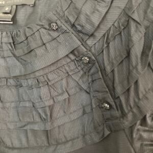 Tiny black sparkly buttons embellish an asymmetrical shoulder closure.