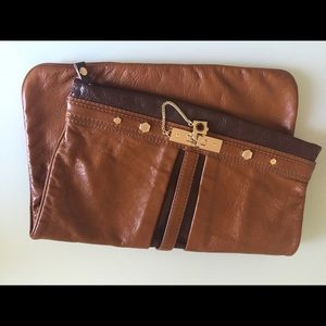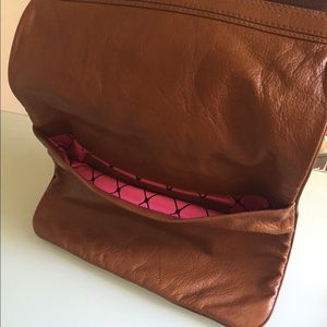 Gorgeous cognac brown oversized clutch with shocking pink interior lining. Gold toned Marc Jacobs lock. High quality leather, like new.