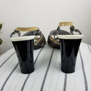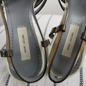 Brown and multicolor patent leather Marc Jacobs slingback sandals with straps at uppers and covered heels.