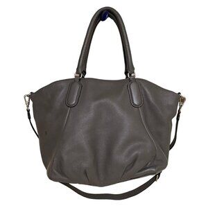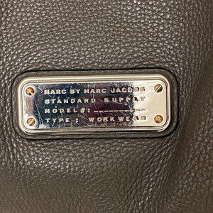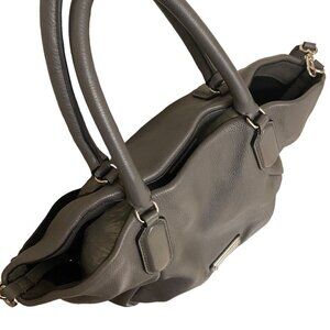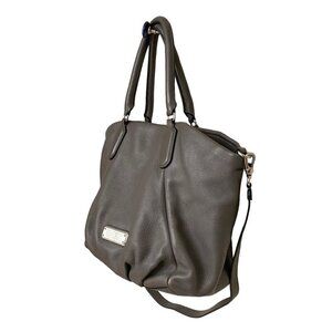 Marc Jacobs Electro Q Fran Pebbled Leather Satchel Crossbody Bag in slate gray. Thick pebbled leather with magnetic top closure, long crossbody shoulder strap and MJ signature silver tone plate on the front. This tote bag has roomy main compartment, a fully lined interior and back wall utility pocket. Double top handles and a shoulder strap offer versatile and comfortable carrying options