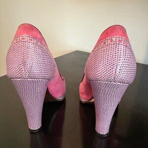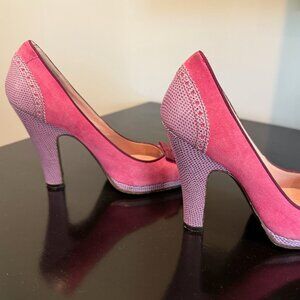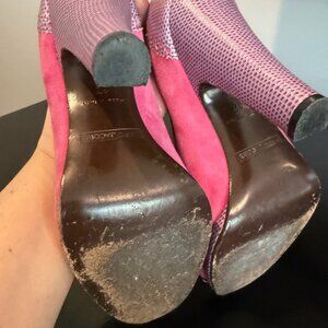 Marc Jacobs Peep toe pumps. Hot pink suede with purple leather heel and detailing. Darker purple bow and trim. Size 37, equivalent to a US 7 but they would work for a 6.5 too. Comfortable, sturdy heel measures 4.25” high. Front platform just under 3/4” high. Good used condition. Visible wear on soles and leather under ball of foot. Slight denim transfer on the suede (the back of the shoe) and natural wear to suede.