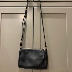 Black, cross body purse. Top zipper, outside pocket with snap.