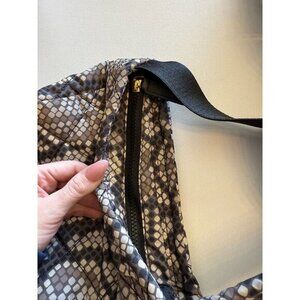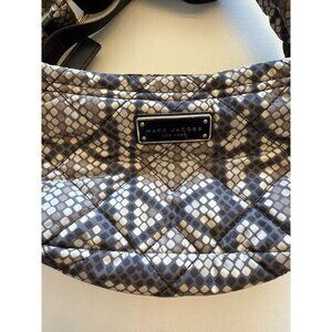 A 100% authentic Marc Jacobs soft quilted nylon fabric crossbody shoulder handbag purse The perfect adjustable crossbody bag due to it's lightweight and "stuff able" fabric in a printed snake reptile design pattern of greige and black. It features gold tone hardware, logo plaque on the front with top zipper pull. Adjustable web and fabric strap and fabric lining with a zipper pocket.