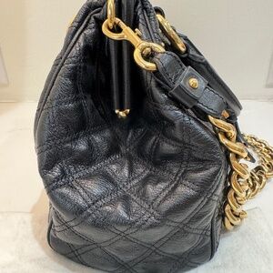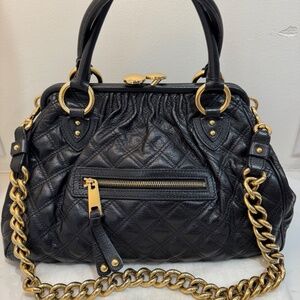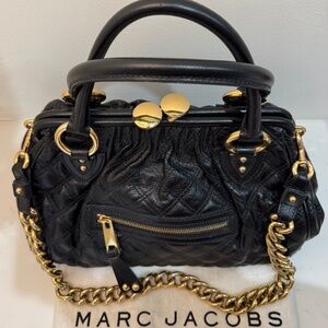Like new. Absolutely no scratches or wear on leather or hardware - including no interior fabric wear and no corner or bottom wear. Black diamond quilt stitch handbag or shoulder bag (optional shoulder strap chain included) with brown fabric interior. Details: rolled black leather handles and polished gold hardware including the iconic (and branded) Kiss Lock closure. One exterior zip pocket and one interior zip pocket with additional brand personalization.