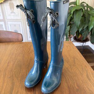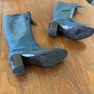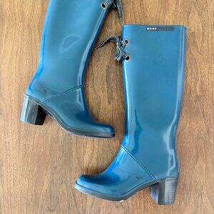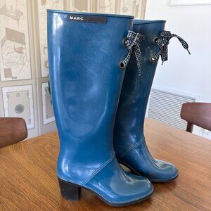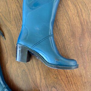 MJ heeled rain boots. Block heel, hits just below the knee, blue with tie at the front. Slight signs of wear - scuff shown here, but otherwise in great condition.