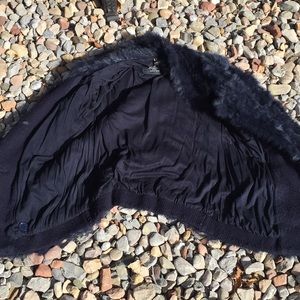 Navy blue jacket with side pockets. Double breasted. Missing one button on the bottom. Originally $1000. Pricing is firm.