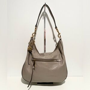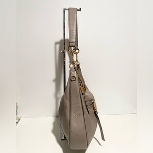 Discover the elegance of this taupe leather hobo bag, perfect for any occasion. Its sleek design and versatile color make it a must-have accessory. Very good overall condition. Small marks noted in photos. Nothing major. Only visible when inspected up close. Sold as is.