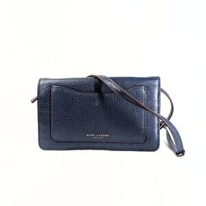 Streamlined and sophisticated, this Marc Jacobs Recruit wallet on crossbody strap doubles as a compact handbag, making it the perfect day-to-night accessory. Crafted from navy blue pebbled leather with a rich burgundy trim and finished in gold-tone hardware, it delivers understated luxury with versatile wear.