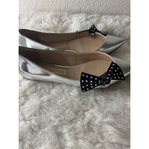 Marc Jacobs Rita Point Toe Ballerina Flats Silver wt Black Bow Women Size 38/US size 8