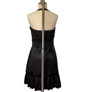 50's inspired black satiny halter dress with sweetheart neckline and cute ruffle trim. Zipper on the side. Made of acetate and cotton with a polyester and cotton lining. Labeled size 4.