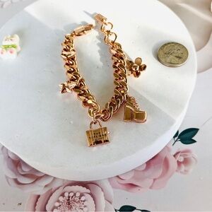 This bracelet features a delicate chain-link design in a rose gold color with small charms hanging from it, adding a personalized touch. The warm, pinkish-gold color contrasts nicely against the skin tone, giving it a feminine and trendy look.