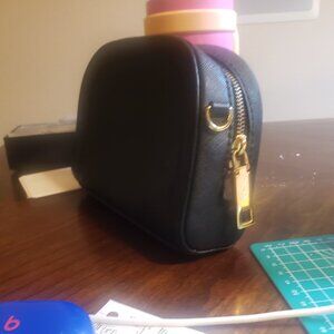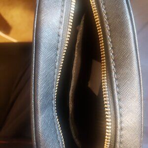 Crafted from durable black saffiano leather, this compact Marc Jacobs crossbody features a structured dome silhouette with gold-tone hardware. The front is embossed with the signature MARC JACOBS New York logo, while a top zip closure opens to a spacious interior with a divider pocket for easy organization. Side D-rings allow for an optional strap attachment, making it versatile to wear as a crossbody or carry as a clutch.