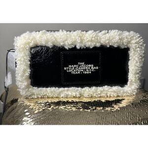 Add a touch of luxury to your wardrobe with this Marc Jacobs Camera Bag! This stylish bag is made from shiny black calfskin and features a faux shearling trim. The compact size makes it perfect for carrying your essentials, while the adjustable strap allows for comfortable wear.