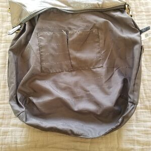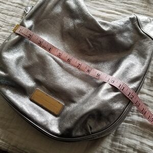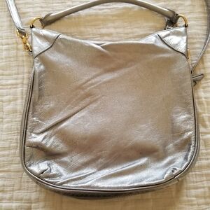Elegant silver hobo bag. Sleek design with adjustable strap. Perfect for any occasion.
