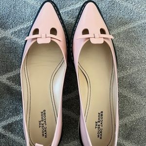 Mark Jacobs Size 7 flat shoe with pink leather and white outer sole. I purchased these shoes right before I got pregnant and never wore them because my foot size changed. So although they are preowned they are in fantastic condition.