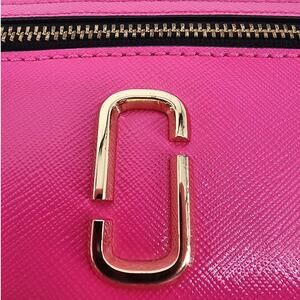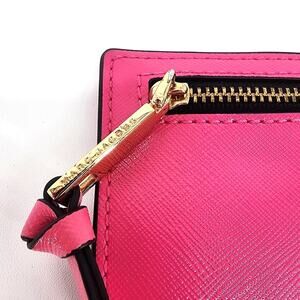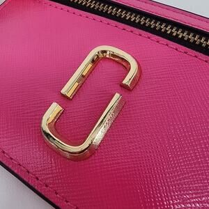 This Marc Jacobs Snap Shot card case adds a stylish pop of color to your everyday essentials. Crafted from textured saffiano leather in three vivid pink tones, it includes multiple card slots and a secure zip coin pocket. Perfect for travel, quick trips, or adding luxury edge to your daily carry.
