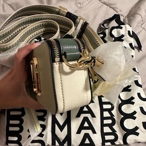 Chic Marc Jacobs crossbody bag in metallic with gold hardware. Features a wide, adjustable strap. Green/Silver Sage/Multi