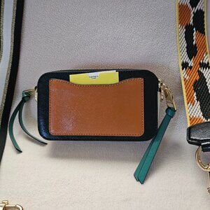 Marc Jacobs Snapshot bag in Black/Honey Ginger. Dual Zip Closure. Original Dust Bag. TWO straps (original and one bought). Wear and tear on gold emblem. Small stain at bottom of bag.