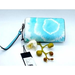A classic compact wallet in an tie dye finish with plenty of interior compartment space for your cash, cards, receipts and everything in between. Light blue/green/white leather The Tie Dye Snapshot wallet from Marc Jacobs featuring tie-dye pattern, logo plaque, silver-tone hardware, all-around zip fastening, press-stud fastening, internal zip-fastening pocket and internal card slots.