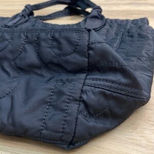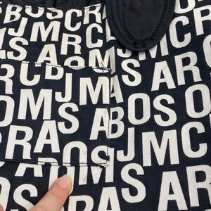Solid Black Quilted pretty nylon Tate Tote by Marc Jacobs. A great casual workwear bag that fits everything! Large enough for travel to use as a weekend bag or carryon with two exterior side slip pockets, two interior side slip pockets and one interior zipper pocket. The large interior compartment is lined with a graphic black and white logo twill and has a covered magnetic closure at the top middle. Very minor signs of use as pictured, I have not tried to remove. Overall excellent condition.