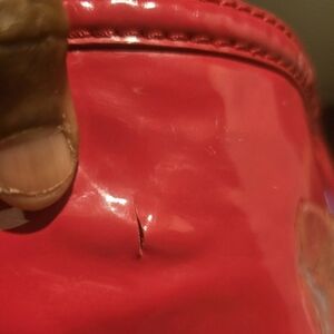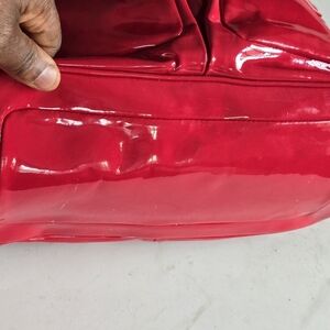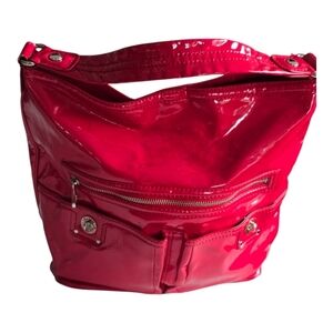 This is a luxurious women's tote handbag made of patent leather with a solid pattern in red pink color. The bag is large in size, measuring 17 inches in width, 15 inches in height, and 4 inches in depth. It features a magnetic closure and double pink handles. The lining is made of Brahmin soft beige logo embossed material, and the hardware is colored gold. The bag is suitable for travel, formal occasions, workwear, and business events. It comes with a key holder and bag charm as accessories. The brand is Brahmin, known for its high-quality designer handbags. The bag has a classy and old-money look, with a touch of mob wife style.