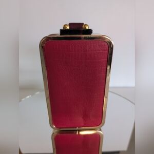 Elegant box bag in plum leather. Features gold trim and hardware. Sleek and modern design. Measures 6 inches long.