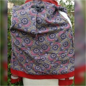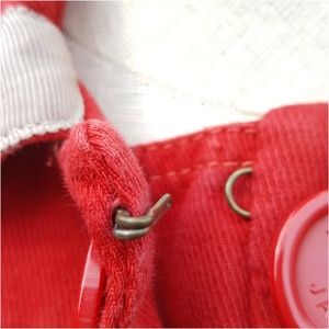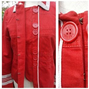 Red jacket with beige grosgrain trim.