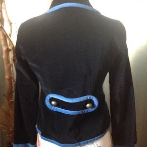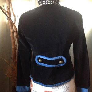 Black velvet blazer with baby blue velvet trim. Flowered lining with gold tone buttons.