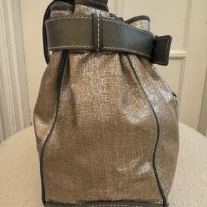 Good condition - fading of leather from eggshell blue to more of a green-blue shade - which gives a slightly designer-distressed look. The original blue color is not visible when using/wearing the tote as inside of straps that lie back to back. Shoulder or hand bag with gold colored metal fixings. Metallic gold and silver woven look outer with cream canvas lining in fairly clean condition.(see photos). ~11 width x 12" height (without strap) x 6" depth. Marc Jacobs is famous for his bucket bags but this is a rare find from his early 2000's high end designer range of clothing (think cream pastel tones tweed boucle suits and separates) and accessories that he no longer creates. Purchased from Nordstrom. From smoke free home.