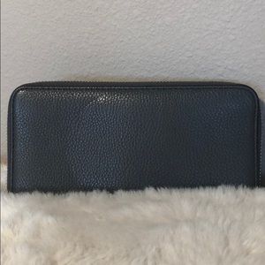 Leather wallet slate gray. Used in good condition. Three pen markings on inside does not take away from function. Approx 7.75x4 inched.