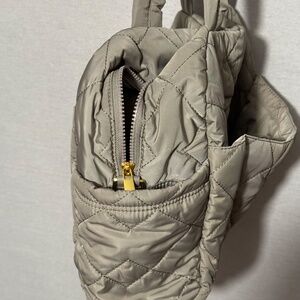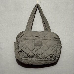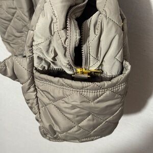 Marc Jacobs Weekender Large Duffle Bag in cement. Does have a few marks that look like oil spots, but I did not try to get them out (see last three photos). They aren't SUPER noticeable because of the shine to the fabric. And it's missing its long crossbody strap, sadly. A diamond quilted bag perfect for a weekend getaway.