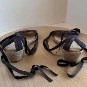 Features: Ribbon lace-up ankle straps, woven jute midsole, open toe