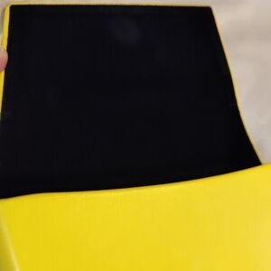 Bright yellow Marc Jacobs magnetic closure sunglass case paired with a bold black and white patterned cleaning wipe. Perfect for adding a pop of color to any outfit.