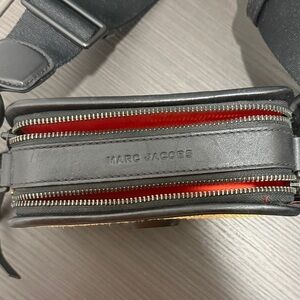 Stylish Marc Jacobs crossbody bag. Features yellow woven front with black accents. Iconic logo detail. Perfect for everyday use.