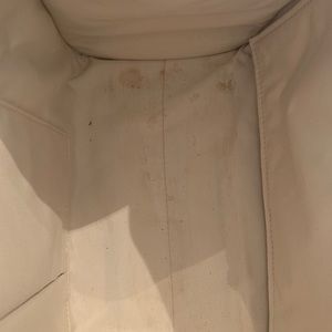 Leather and in great condition. Stain can be cleaned.
