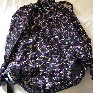 Beautiful Nylon black and purple backpack with hand straps. One large inside pocket and one small outer pocket it opens up really wide and the inside is super cute! It’s a medium to large size backpack and could hold multiple books and a laptop! Go back to school in style!
