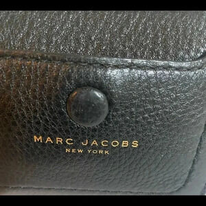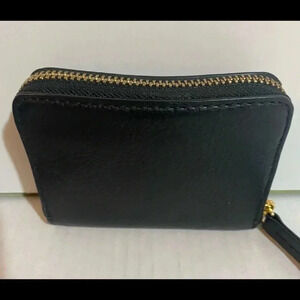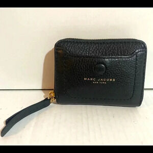 Marc Jacob’s black leather wallet with gold tone hardware main compartment 3 open pocket 1 snap pocket at center logo at front zip closure at top hight 4” width 4.5” depth 1” Bag dimensions are based on approximate measurements before placing an order please take a moment to view all photos using feature for a closer look
