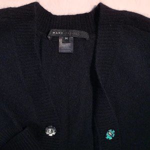 Never worn black Marc Jacobs Cardigan size Medium. 50% Angora rabbit hair/50% Lambs wool. One button closure. Hits right at waist line. Half sleeve hits just below the elbow. Slight puff to the shoulder. Cute piece to dress up an outfit.