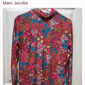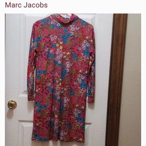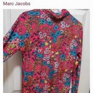 Marc Jacobs floral “60’s Mod” psychedelic floral print dress in vibrant fuchsia, yellow and turquoise. Made of lightweight stretch-jersey with a neat turtleneck collar. Mod