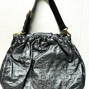 This listing is for a black leather shoulder bag with a fold-over clasp by MARC by Marc Jacobs. It features a single leather shoulder strap (adjustable) and gold-toned hardware. The bag is lined with black and white lettering fabric while the exterior is embossed with letters. The interior features a zipper pocket and two slip pockets. There is a large open pocket on the back of the bag with a magnetic button closure. There is slight discoloration to the interior fabric lining. This bag measures approximately 12 inches across, 12 inches tall and 2 inches deep (but is expandable).