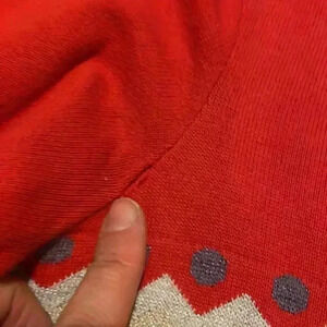This is a gorgeous sweater. The chest is 38 inches. The length is 22 inches. Please see the last photo for the only flaw in the sweater. It is not a full hole but a separation in the seam.