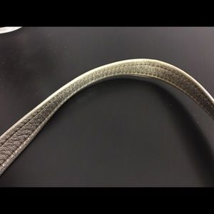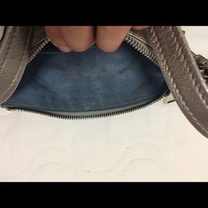Adorable mini metallic shoulder bag with blue suede interior. Main bag has interior pocket, extra outer zipper compartment, 2 small outer pockets with metal tab latches. Bag measures 8.5"L x 1.5"W x 6"H. Dust bag included. Handle shows wear where purse was carried (see underside of handle in photo. Topside only shows wear along edges.) Suede lining is a bit dirty from use but could be cleaned. Price absolutely negotiable.