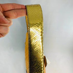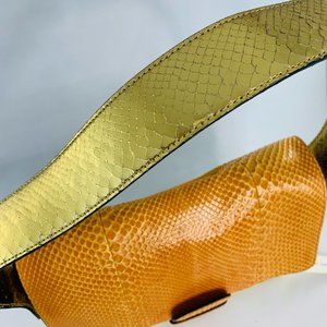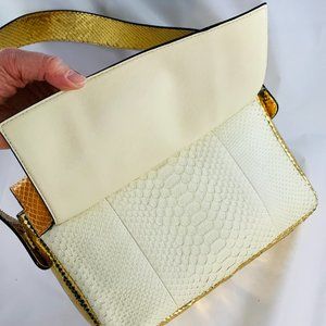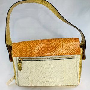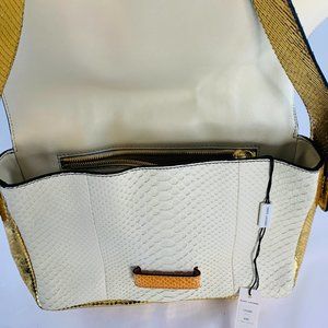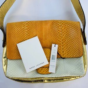Marc Jacobs ivory, gold, citrus leather and python handbag with interior pockets and exterior zip pocket. New with tags.