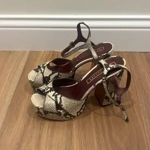 Marc Jacobs creates these stunning sandals that will help you create a chic look. Crafted from python-embossed leather in a black shade, these beauties are adorned with crisscross straps that elegantly frame the foot. The sandals are elevated on block heels supported by chunky platforms.
