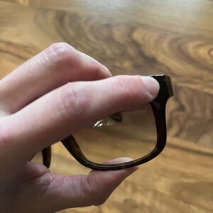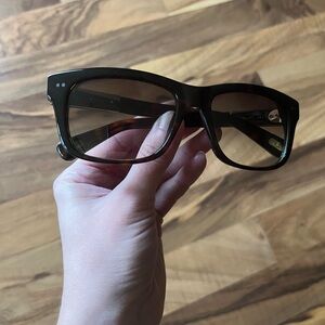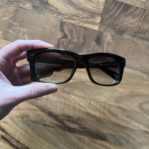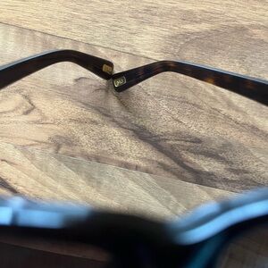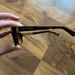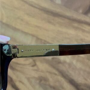 Marc Jacobs sunglasses. In decent condition! There is a tiny scrape on the front corner as shown in the second to last pic. The gold on the inside has some wear and tear as shown in the last pic, but not noticeable from the outside.