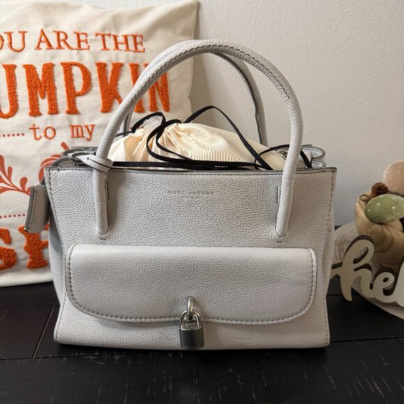 Dual rolled top handles -Exterior features silver-tone lock, handle charm - Interior features media pockets, zip wall pocket and center zip divider - Approx. 8.5" H x 12" W x 6" D - Approx. 4.5" handle drop, 18-22" strap drop - Imported