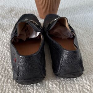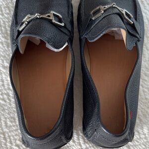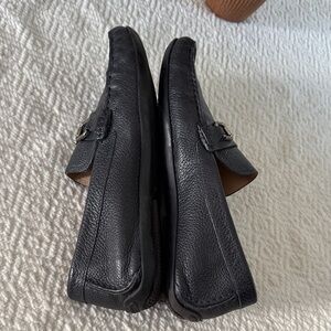 Elegant black leather loafers with silver buckle detail. Comfortable and stylish for any occasion.